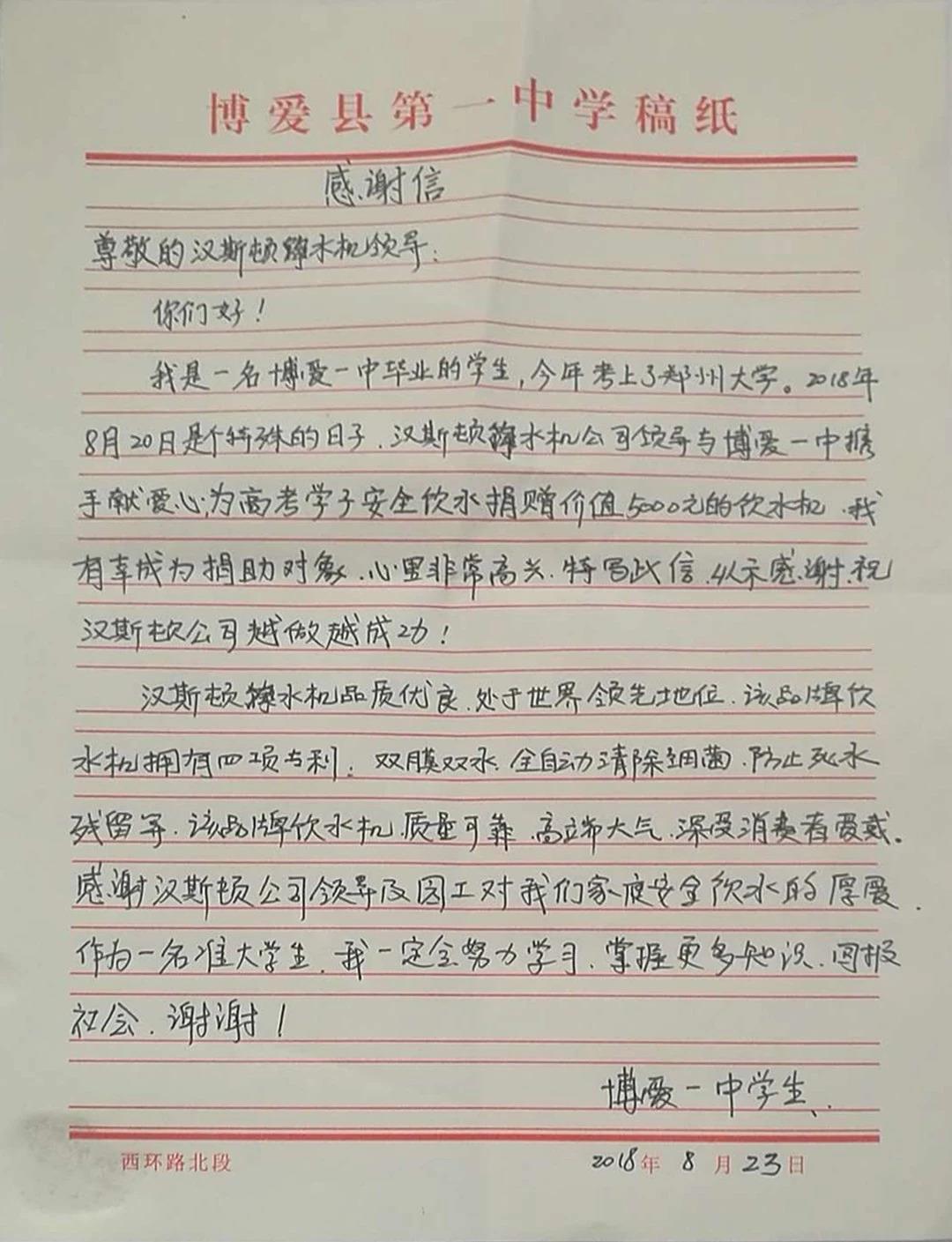 原来是河南博爱县一位受助的高考学子为感谢汉斯顿的爱心捐助,以及对其家庭饮水环境的关注,特此写下感谢信表示感谢。信中对汉斯顿产品给予充分的赞誉,表达对汉斯顿公益的触动,并期待未来的自己也能回报社会,感恩社会!