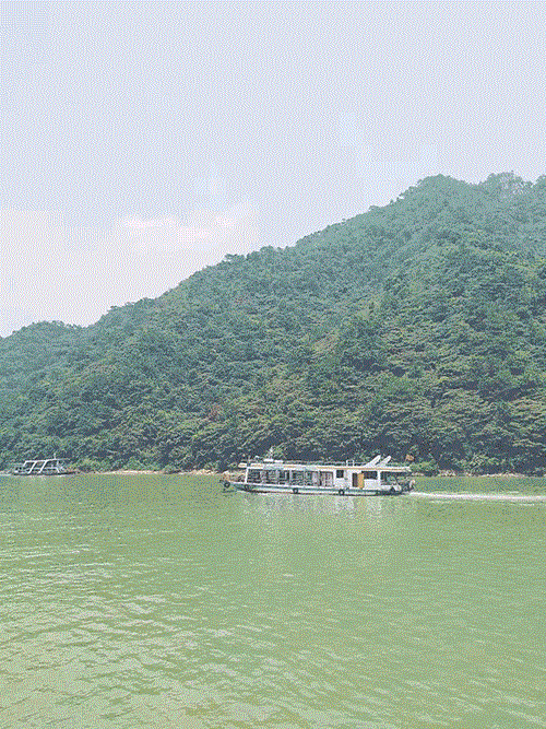 第一天中午,便安排游船午餐,在码头乘船游览「北江小三峡」。这里风平浪静、山峦青翠欲滴、江湾碧绿清澈,一派诗情画意。