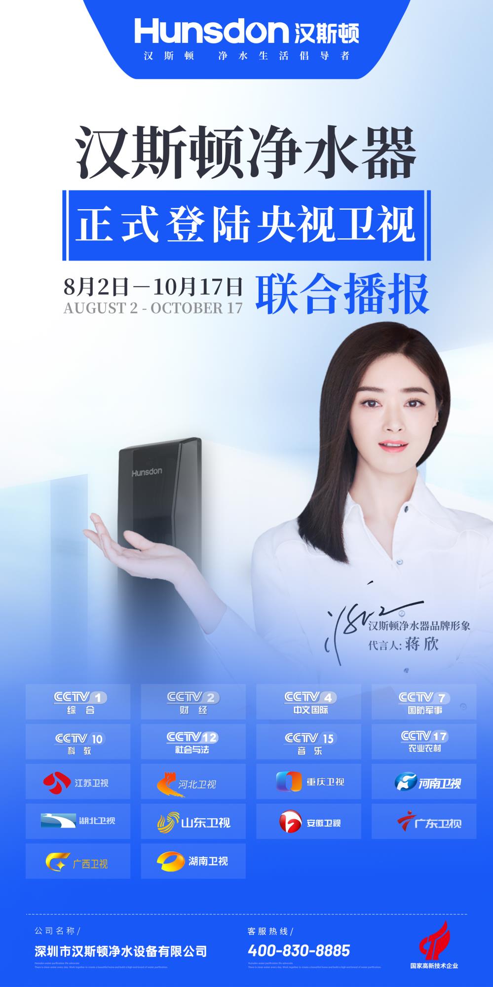 强势来袭!8月2日汉斯顿净水器正式登陆央视、卫