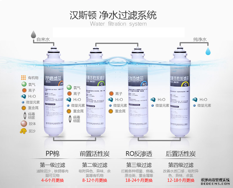 2、第一代净水器主要通过活性炭、陶瓷等简单过滤,容易滋生细菌,污染水源,达不到洁净水源的效果;第二代净水器使用了各种人工高分子膜过滤,对去除水中有害物效果显著,但它致命的缺陷是过滤掉了对身体有利的微量元素。第三代净水器采用的是纳米微晶滤芯技术,很好的解决了第二代净水器的缺陷,过滤掉了水中有害物质及重金属等。所以大家选择净水器时,一定要问清采用的过滤技术以及滤料,看是否满足自己的使用需求。