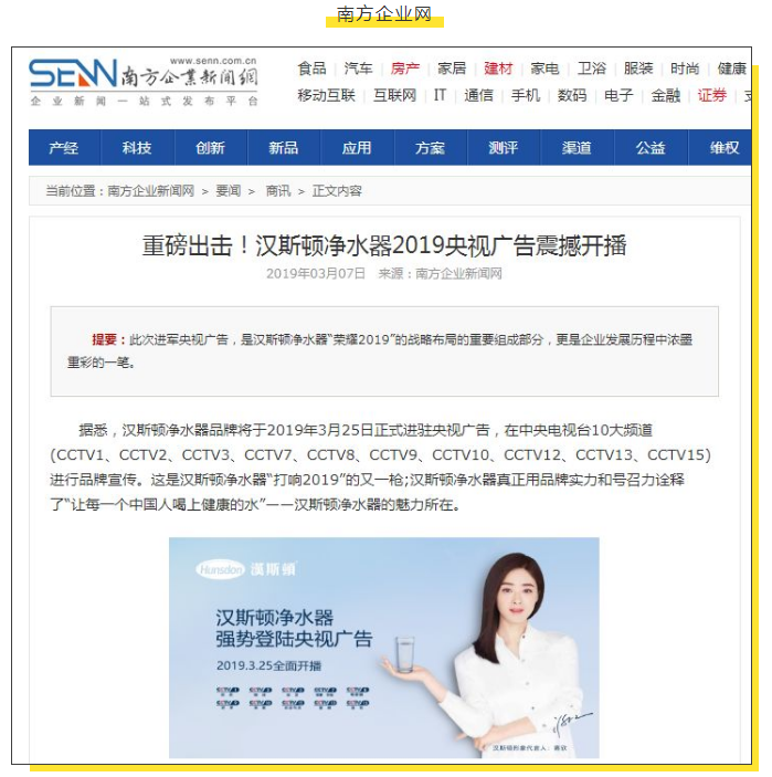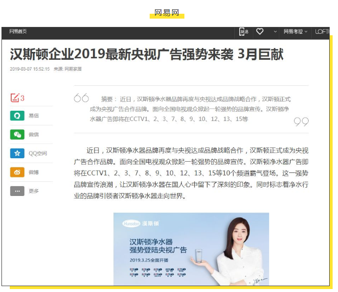 而此次汉斯顿净水器央视广告将从3.25日起全面开播,更多信息敬请关注汉斯顿微信公众号 ——“汉斯顿净水器集团”。