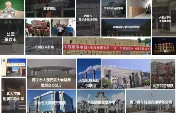 汉斯顿还是中国运载火箭技术研究院、中铁装备集团、天津市铁路运输检察院等国家重点单位的水质净化供应商,与中国农业银行、中信泰富等百强企业或上市公司建立良好合作关系。依靠强大的专业能力和核心技术,汉斯顿力求为用户提供更佳的解决方案。