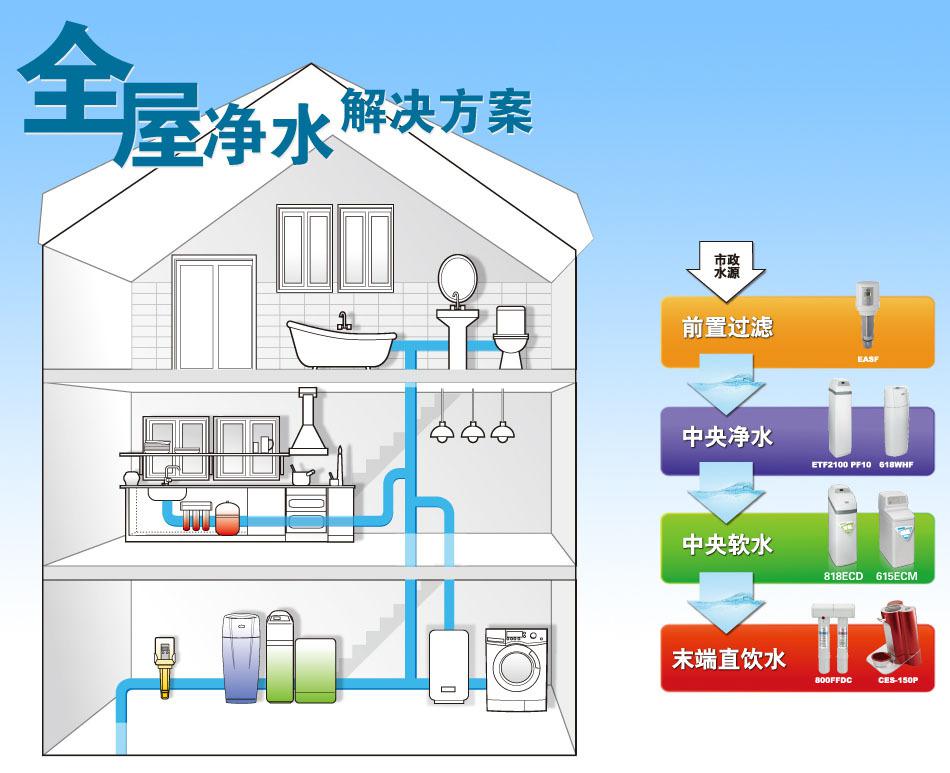 汉斯顿的净水专家介绍全屋净水器是一种大型的水处理设备,适合全屋中央净水,其核心技术主要是微滤(PP纤维棉和活性炭)、超滤(中空纤维)、KDF、陶瓷滤芯等。该组件一般都是安装在总进水阀门处,所以,在装修的时候最好找专业的水处理公司事先将水路作好或者预留出出水口,以免装修以后无法安装,造成一定的遗憾,并且将电源预留出来。全屋净水器详细介绍——全屋净水器的分类: