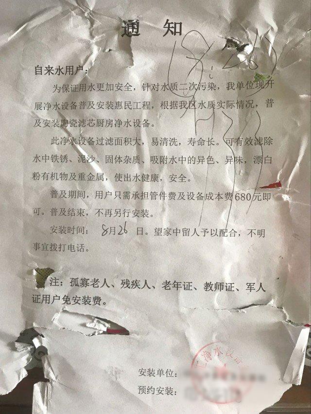 李女士说,今年的8月26号早上,她发现家门口多了一张通知。上面写道:开展净水设备普及安装惠民工程,普及安全净水设备。没过多久,便有一个自称是某净水设备安装处的工作人员上了门。